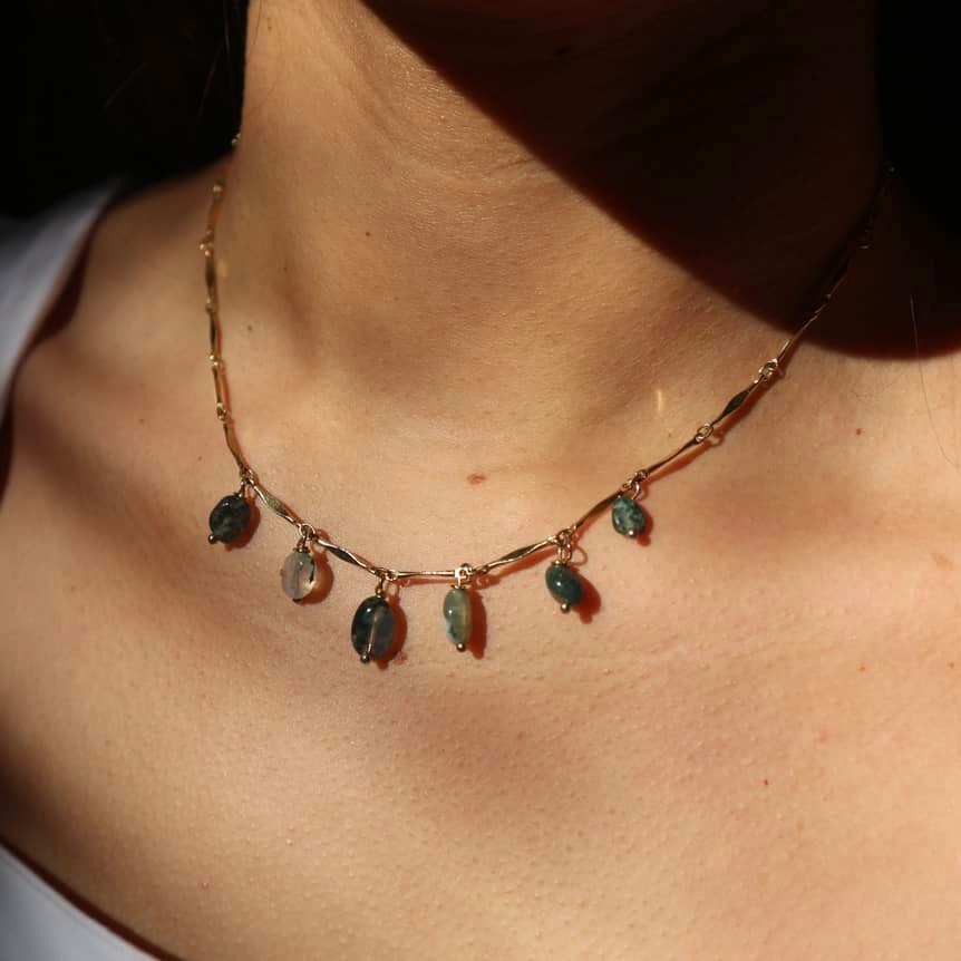 This necklace is made with Moss Agate, a nurturing and balancing stone that opens the heart while strengthening your intuition. It helps you increase discernment, guiding you to invest your time, love, and energy into the people and situations that truly reciprocate. Moss Agate also supports emotional balance and grounded decision-making, making it a powerful ally in breaking cycles of overgiving.